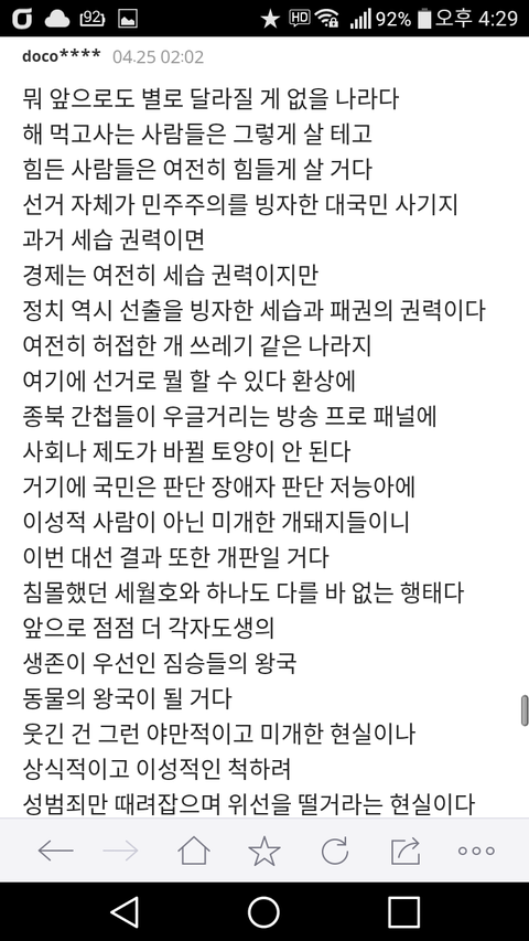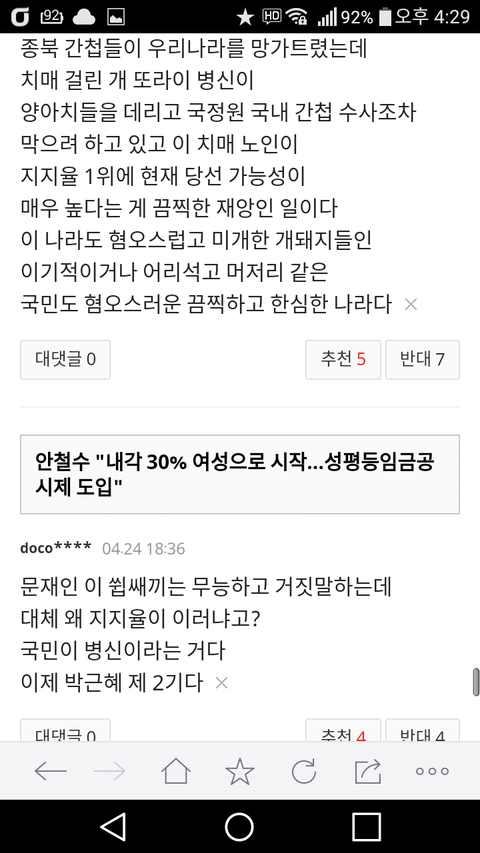 그게 바로 독재국가다 국민 대신 권력자나 권력에 온갖 아첨 아부를 하는 앞잡이 하부 관리자가 판단을 내리고 국민을 개돼지 취급하는 게 개돼지라 대놓고 욕하고 무시해야 개돼지로 보는 게 아니다 독재자의 안위 권위 이익 기분 상태 위상만을 위하며 완장 찬 졸개들은 독재 시스템의 악랄하고 혐오스러운 기질을 발휘하는 것 자체가 국민을 지배의 대상으로 개돼지로 여기는 증명이 되는 거다 여기 네이트 댓글 관리에 편파적이고 쓰레기 같은 구조의 네이트도 과거에 볼 수 없게 대선 후보에 불과한 문재인은 철벽을 치고 독재적 발작적 작태 역시 그 증명이 되는 일이다 이건 이명박 박근혜 정부조차 없었던 일이다