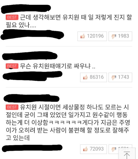 요즘 연애혁명에서 어린이집일로 고딩이 저러는게 유치하다고하는데 안당해본사람은 모를걸; 난 지금은 중3이고 초1때 남자애한테 엄청 심하게 괴롭힘당했었어 가장 기억에남는건 가방셔틀시킨거랑 장난삼아 명치때리던거다... 지금 생각해도 너무 괴로운데 옛날일갖고 왜그러냐고 하는애들은 그만큼 행복하게 자란거니 부럽기도하고 원망스럽기도 하네
