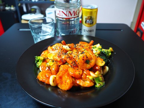 냉도새우로 감바스요리를 몇번해먹었더니 맛있어서 시도해본 요리입니다. 전분가루를 묻혀서 튀긴담에 버터넣고 볶아주다가 칠리소스 넣고 몇번 휙휙 하면 끝!! 칠리소스는 시판소스였는데, 맛이 그닥이라 새우가 좀 아까웠습니다. 속상해서 진토닉과 함께....