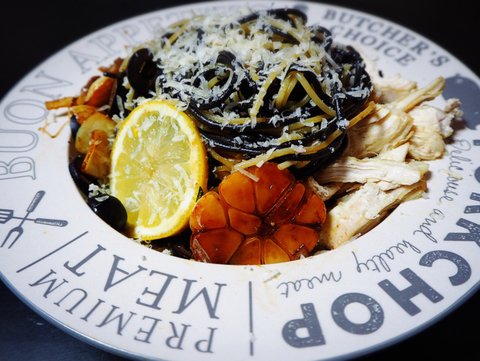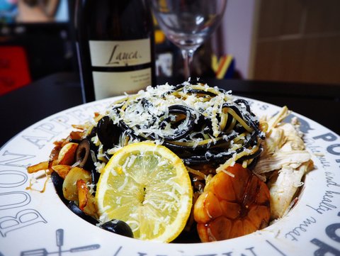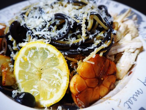오징어먹물면을 빨리 처리하고 싶은데, 아직도 많이 남았습니다. 알리오 올리오에 단백질을 위해 추가한 닭가슴살... 변태적인 요리입니다ㅋㅋㅋ