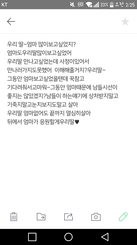 아 좀 창피하지만 엄마가 보고싶어서 제가 엄마인척하고 저에게 편지쓴거에요 ㅋㅋㅋ보고싶고 힘들때마다 이거 읽어요 저같은 친구들있으면 이렇게 해보세요 도움 많이 되더라고요