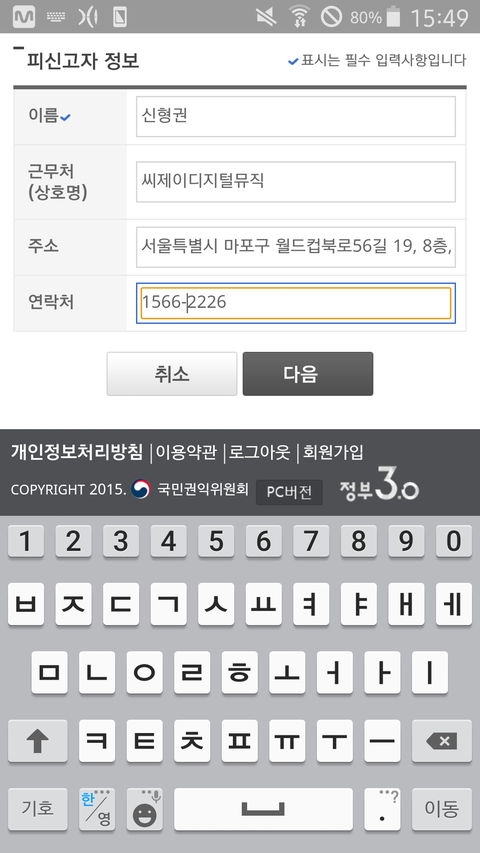 피신고자 주소 : 서울특별시 마포구 월드컵북로56길 19, 8층, 9층 (상암동, 드림타워)