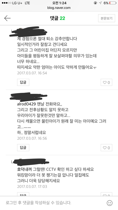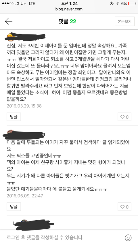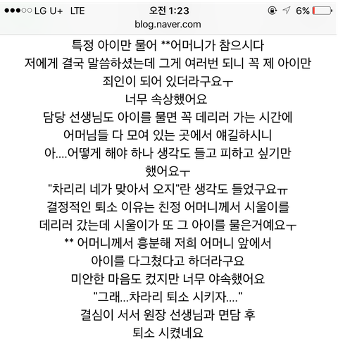 저런것들이 맘충임. 아이가 물수는있다 칩시다. 그런아이는 아직 공동체 생활을 할준비가 안된겁니다. 공동체란 그 크기가 작건크건 나이가 많건적던 남에게 피해를 주지말아야만 가능한건데 무는아이케어는 전적으로 가정에서 해야하고 훈육으로 고치던 나이먹어고치던 다 고친후에 공동체에 합류해야하는건데...얼마나 이기적이면 저 ㅈㄹ들을떠는지 이해가안감. 아이 공격성하나 케어못하면 가정교육 어떻게시킬려고? 너무 추잡하고 이기적이고 몰상식함