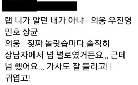 이번에 랩포지션 선택에 니가알던 내가 아냐 노래라고 해서 팬들 전부다 절지만 마라.. .절지만 마 하고 왔는데 후기가 떳는데 잘했대요 많이 늘었대요. 실력 많이 늘고 있고 진짜 새벽까지 열심히 하는 애인데 보여줄 기회조차 없을까봐 진짜 마음 아파요ㅠㅠㅠㅠ