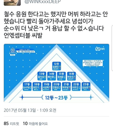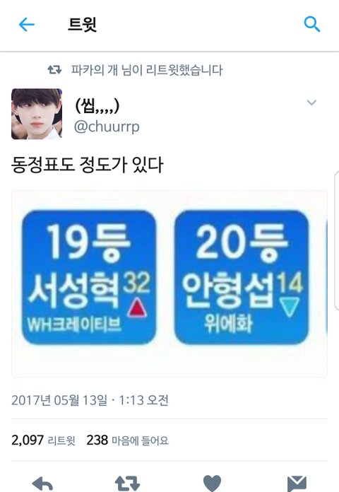 왜 안형섭 위에 있으면 안되는데? 쟤가 잘못한거 있어? 노래를 못하는것도 춤을 못추는것도 노력을 안하는것도 아니잖아. 쇼크 무대 봤으면 알겠지만 쟤 19살에 노래도 잘하고 춤도 잘춰. 물론 노력도 엄청나게 하니까 가능한거고. 이번 2차경연에서도 반응 되게 좋았었어. 차라리 뭔가 잘못한게 있으면 억울하지나 않지, 단지 순위가 올랐다는 이유로 욕먹어???