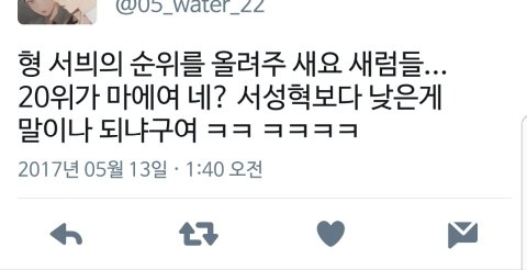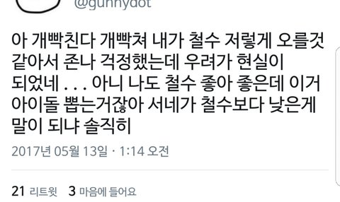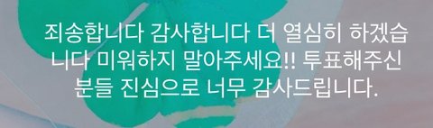 이거 서성혁 카톡 상메래 19위했는데 죄송합니다 미워하지 말아주세요라는 말이 먼저나와ㅋㅋㅋㅋ 서성혁팬들도 여기저기서 하도 후려치니까 19위했는데 좋아하지도 못하고 다들 멘탈 나가서 떨고있어