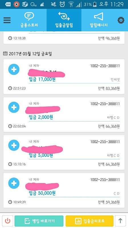 어제 네 분이 각각 50,000원, 5,000원, 2,000원, 17,000원을 입금해주셨고 오늘는 한 분이 13,000원을 입금해주셔서 총 입금액 96,368원입니다