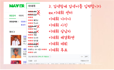네이버에 '이대휘' 쳐본사람은 알겠지만 지금 대휘 연관검색어가 말도 아니야ㅠㅠ 대휘도 서치 많이 할테고 사람들도 '이대휘' 검색해볼텐데 좋은말만 나오게 해줘야지~ 한번씩만이라도 검색 부탁해! (혹시 수정할거있으면 알려줘!)