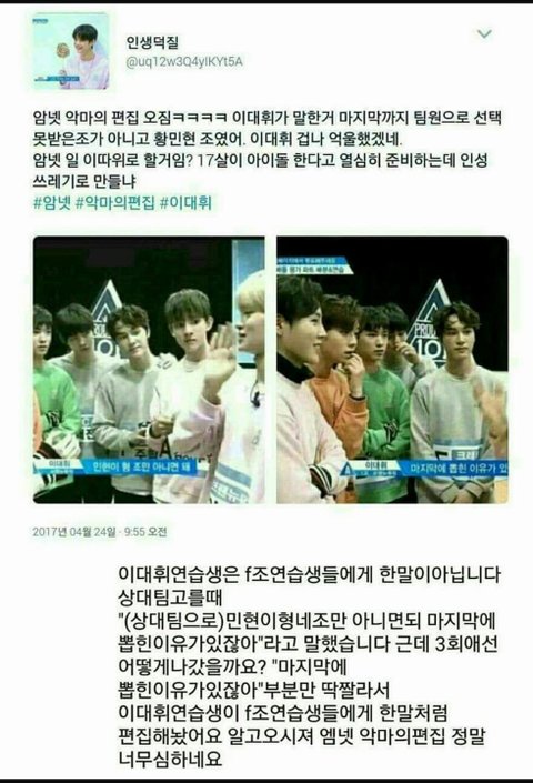 101에서 대휘 주늑들어있는거 보고 되게 마음 아팠어요 제발 대휘한테 악감있는분들 혹 악플다시는분들 엠넷 편집때문이니까 대휘욕하지말아주세요 엉엉