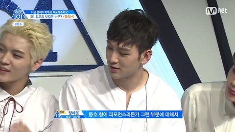 연습중 세운이에게 웃어주며 화이팅하는 모습