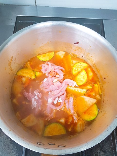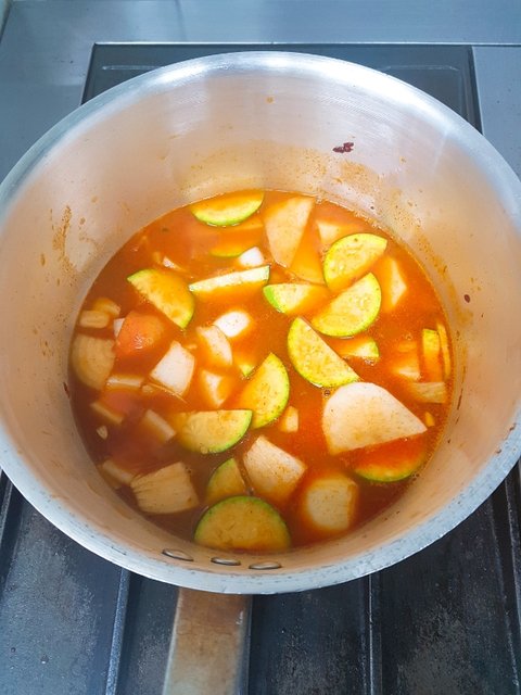 냄비에 물600ml넣고 냉장고 손질된 야채들(감자.애호박.양파.당근) 넣어요