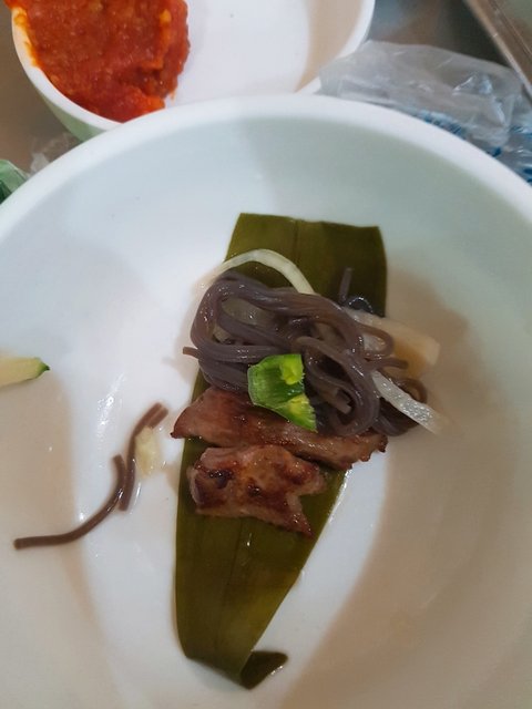 명이나물위에 돼지고기.냉면.냉면무우한조각.양파 꿀조합