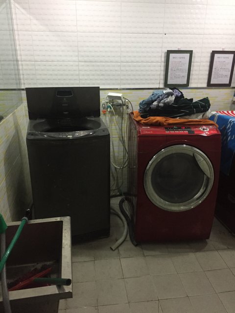 왼쪽이 제가 사용한 세탁기입니다. 빨래가 끝났는데 안가져갔을 경우 다음에 사용하는 사람이 오른쪽처럼 세탁기위에 빨래를 놓아 둡니다.