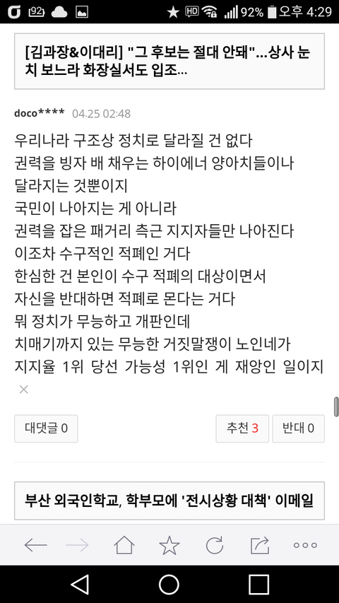 그게 바로 독재국가다 국민 대신 권력자나 권력에 온갖 아첨 아부를 하는 앞잡이 하부 관리자가 판단을 내리고 국민을 개돼지 취급하는 게 개돼지라 대놓고 욕하고 무시해야 개돼지로 보는 게 아니다 독재자의 안위 권위 이익 기분 상태 위상만을 위하며 완장 찬 졸개들은 독재 시스템의 악랄하고 혐오스러운 기질을 발휘하는 것 자체가 국민을 지배의 대상으로 개돼지로 여기는 증명이 되는 거다 여기 네이트 댓글 관리에 편파적이고 쓰레기 같은 구조의 네이트도 과거에 볼 수 없게 대선 후보에 불과한 문재인은 철벽을 치고 독재적 발작적 작태 역시 그 증명이 되는 일이다 이건 이명박 박근혜 정부조차 없었던 일이다