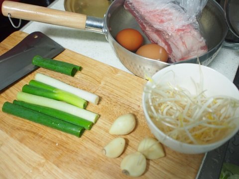 재료는. 면 파, 삼겹살, 숙주, 마늘, 계란,