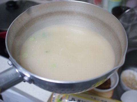 육수에 마늘 조금, 파 조금, 후추 넣고, 생강가루 조금 넣고