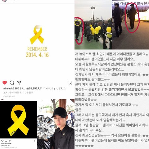 세월호 노란 리본 매년마다 인스타에 올리고 프로듀스 101 첫 휴가때 세월호 추모하러 까만옷에 까만 모자쓰고 일반인처럼 갔음 (목격담에는 추모하면서 울었다고 쓰여있엉)