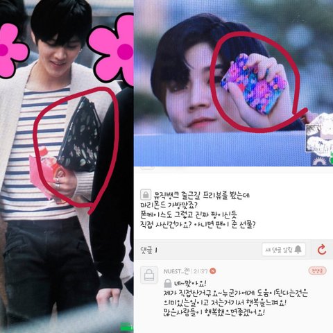 사복짤에서도 마리몬드 가방이랑 폰케이스 가지고 있구 이거 직접 사비로 산거래(팬들이 준거 아님)