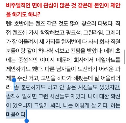 이제 '남자답게' 해보려구요, 가아닌 그저 이미지 변신 이었다고만 말했을뿐 평소 마인드 자체에 젠더를 나누는 개념이 없음