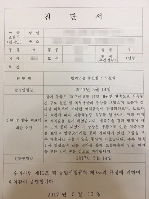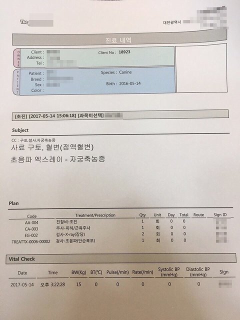 이 진단만 믿으면 안될꺼같아 다른 병원에 데려가 진료를 보고 수술을 결정하려고 다른병원에 가서 진료를 보았습니다.