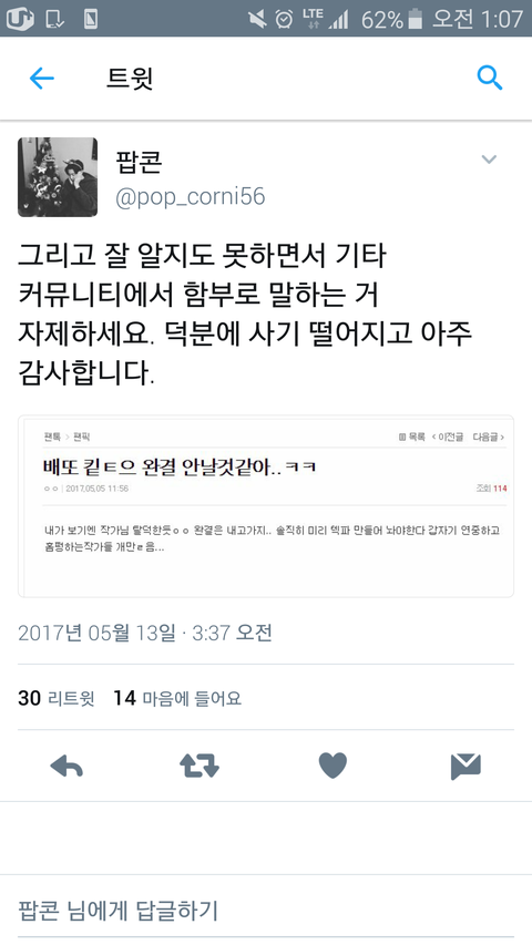 이런 경우처럼 여기가 폐쇄된 곳도 아니고 누구나 볼 수 있는 개방된 곳이라서 당연히 작가님들도 볼 수 있다고 생각해 말 좀 조심해줬으면 좋겠어 저런 글 보면 작가님들이 뭐라 느끼겠어.. 저 글 쓰니는 삭제하고