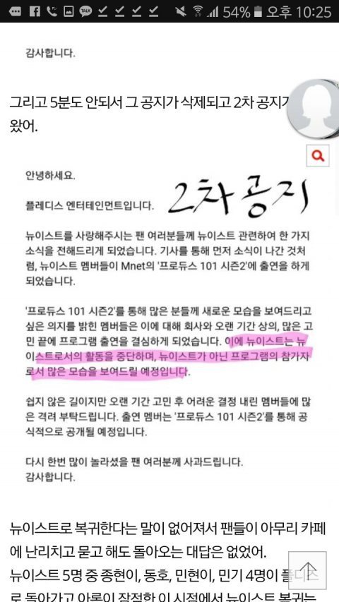 일단 위에 사진처럼 그 공지글은 게시된지 5분만에 수정되서 다시 올라갔고, 거기엔 ㄴㅇㅅㅌ 복귀 이런 말 사라지고 활동 중단이라고 말이 바뀌었어. 멤버중 유일하게 프듀에 안나온 멤버는 지금 거의 잠적수준이어서 뭐하고 있는지도 몰라.