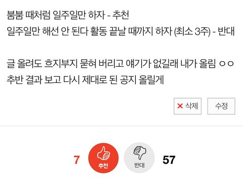 결과는 "최소 3주" 이상 하는 걸로 결정됐어 팬톡 다수의 캐럿들이 반대를 눌렀고 사진에서도 보이다시피 차이가 꽤 많이 났어 찬성을 누른 소수 캐럿들 이번만큼은 무조건적으로 이 결과를 받아들여 줬음하는 바람이야