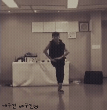 한쪽에 무릎 아대를 차고 안무 연습하는 중