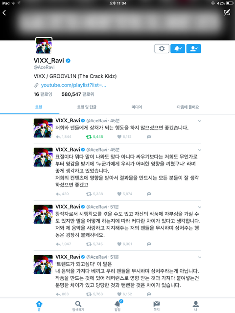 표절에 발뺌 당하고 욕 먹고 있는 우리를 감싸주는 라비가 너무 고맙고 자랑스러울 따름. 곧 5주년을 향해 달려가고 있는 빅스가 초심잃지 않고 팬생각해주는 모습에 별빛들은 감동하고 늘 감사함을 느낌