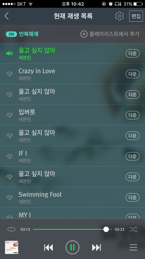 이거 반복재생 누르는거 맞아 ㅠㅠ? 안누르니까 막 랜덤으로 틀어지던데.. 그리고 블투스피커로 들어도 괜찮겠지??
