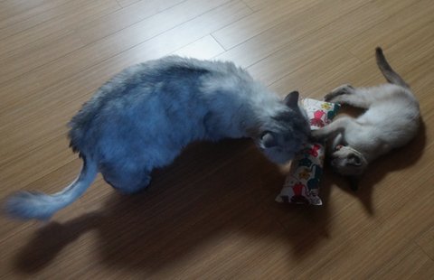 동생 호두가 캣닢 쿠션으로 뒷발치기 하는 걸 유심히 보더니,