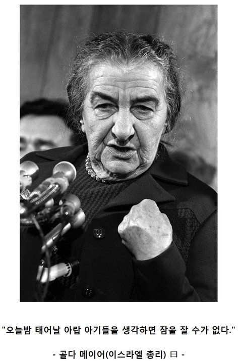 골다 메이어 총리시절 이스라엘군은 조직적으로 팔레스타인 어린이들을 조준사격하는 경우가 많았다고 한다. 그 이유는 그 아이들이 자라서 테러범이 될 것이라 확신했기 때문에....