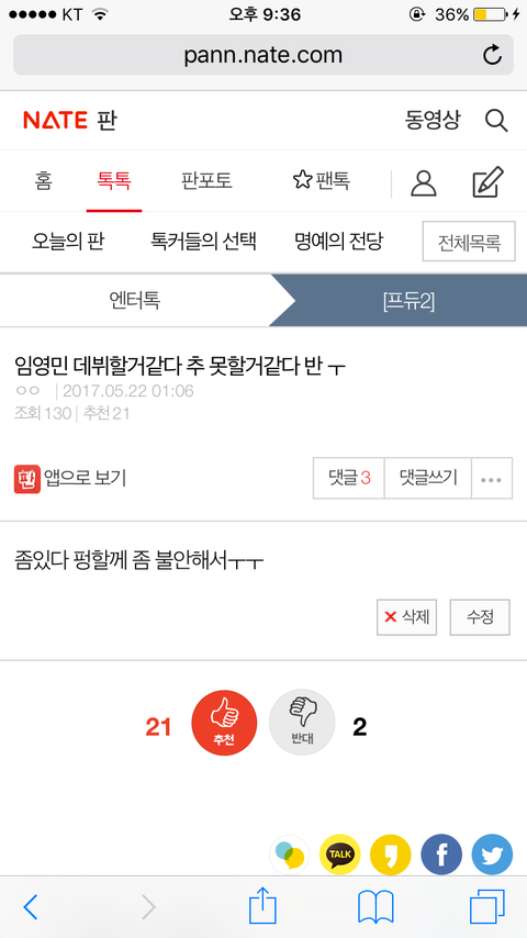 반응 이렇게 좋았는데.. 하루하루 금요일에 순위 올라가서 웃을 니 얼굴만 상상했는데ㅠㅜㅜ 다음주 금요일이 무서워 얼마나 풀이 죽어있을까ㅜ 하루하루 행복하게 연습하고 있다는 말에 진짜 기뻤었는데 오늘 너무 답답하다 얼마안남은 이시점에 터진게 원망스러움..
