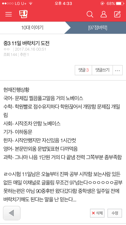 저 글 본 사람은 별로 없겟지만ㅎㅎ귀찮아서 매일올리진 않앗지만 댓글달아준 세명 보라구 올림 그래서 결과는 11일 벼락치기하고 97점맞음ㅋㅋㅋㅋㅋㅋㅋ반에서 일등함... 내가생각해도 어이무다 쨋든 기분은 ㄹㅇ좋음