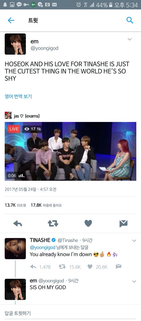 어떤 해외 아미이신 분이 호석이가 라디오에 나와서 자기가 가장 콜라보하고 싶은 아티스트는 티나셰라고 수줍게 말하는게 세상에서 제일 사랑스럽다고 짹짹이에 올렸는데...티나셰가 그 밑에 자긴 이미 준비됬다는듯한 어투의 짹을남김...보고 정말 방부심 폭발ㅠㅠㅜㅜㅠ꼭 콜라보 성사되길!!