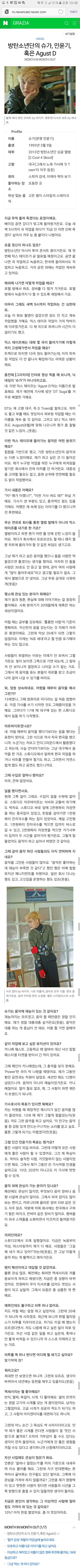 그때 한때 어거스트디 믹텦준비할때 했던 인터뷴데ㅜㅜ정말 한마디한마디에서 윤기의 인간성이 느껴진다 방탄소년단의 슈가로서도 인간 민윤기로서도 정말 멋있고 배울점 많은사람이라는걸 다시한번느낌!!!민슈가천재짱짱맨뿡뿡ㅇ