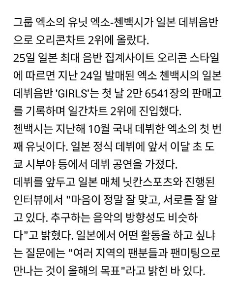 엑소 첸백시, 日 오리콘차트 2위 진입