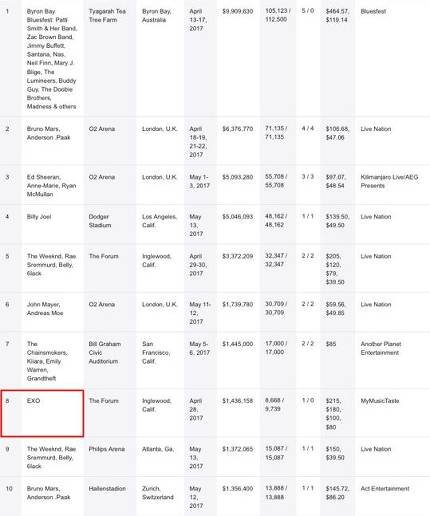 [뮤직IS] 엑소, 美빌보드 박스스코어 차트 8위 '韓유일'