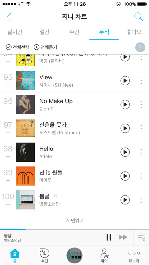 봄날이 즨희뮤직 누적차트에 드디어 올라왔어!