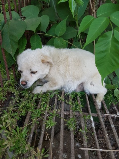 뜬장에 발이 빠져 움직이지도 못하고 한쪽에 움크려 있었습니다.