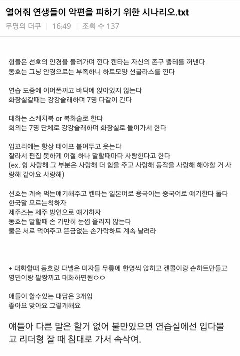 그 외에도 녤이랑 선호, 백호랑 학년이 손잡고 화장실 가고, 혼자가더라도 문워크로 가라는거ㅋㅋㅋ ㅈㄴ 웃겨ㅋㅋ