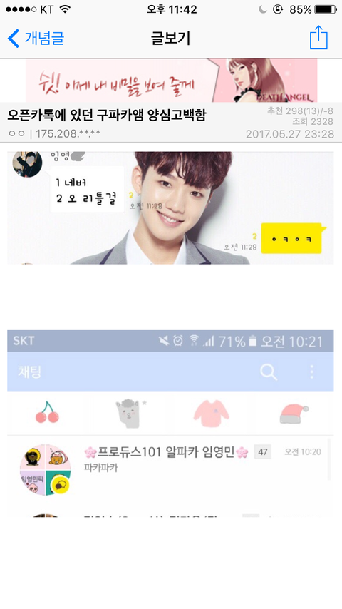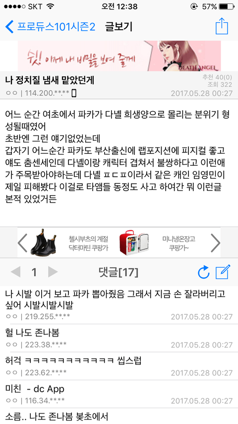 페북에 파카 부정행위 관련해서 올라온건데 링크 가보면 알겠지만 강다니엘 머리채 잡으면서 임영민 쉴드치는 글이 더 많음