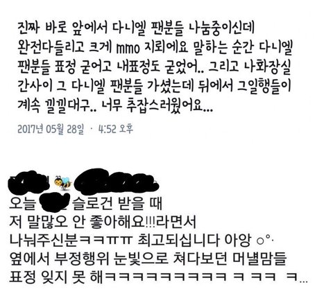 +추 이 짤에 언급되는 연생중 한명이 ㅂㅈㅇ인데 ㅂㅈㅇ 팬들은 그런 말 언급한적 없대 근처에서 같이 슬로건나눠주다가 사람들이 오해했나봐