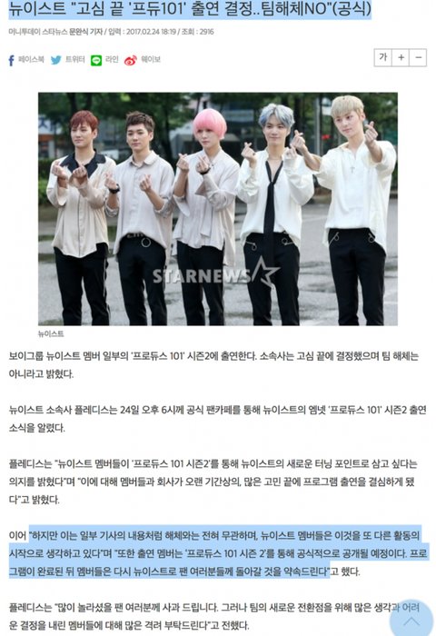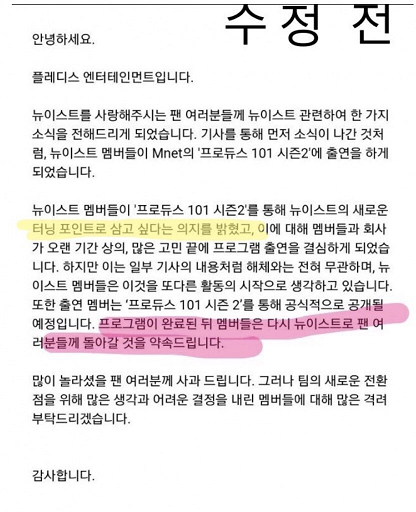 소속사 공식입장 = 뉴이스트에게 프듀란 터닝포인트