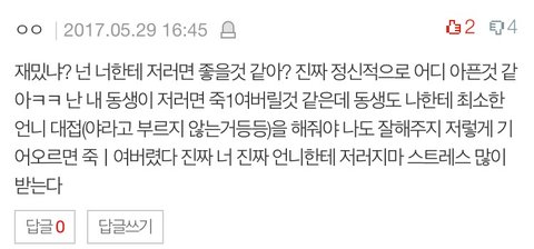 조금 보기 기분나쁜데 댓쓰니 너는 상대방의 입장을 고려해보고 배려해서 이딴 개같은 단어들이 나오는 거니??