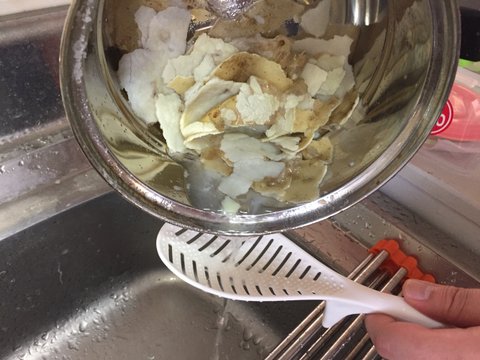 혹시라도 감자껍질이 쏟아질 수 있기에주걱을 거름망 삼아 물을 제거했습니다