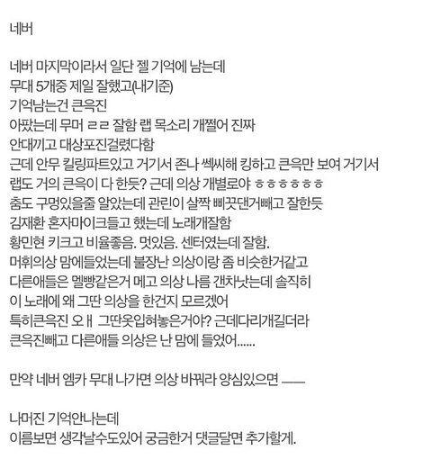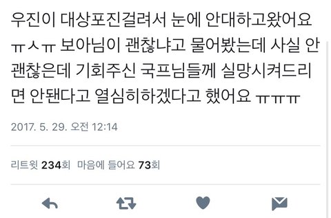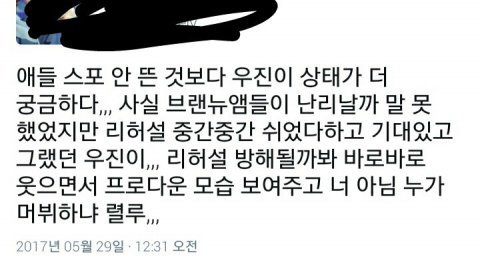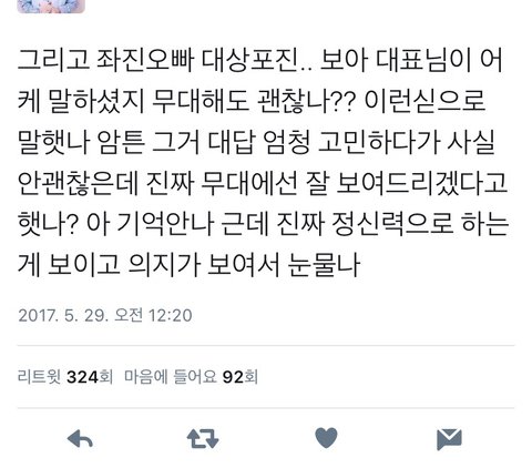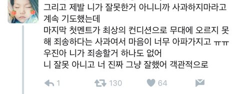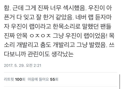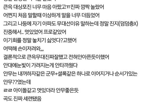 후기 올라오는 거 그와중에 우진이 잘햇다고하는 글 올라오는 거보면 진짜 한편으로는 대견하고 맘이 너무아파..