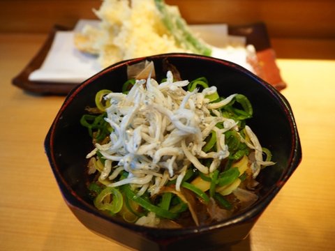뱅어 비슷한 치어가 올라가있는데 가마쿠라 지역에서 저 생선을 이용한요리를 많이 볼수있습니다. 전혀 비리지 않고 맛있습니다.