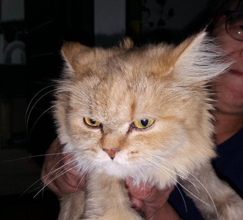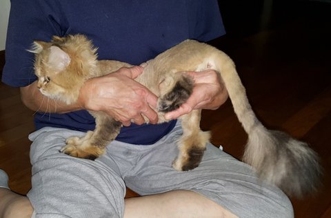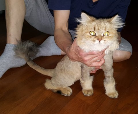 얼굴과 꼬리 그리고 다리만 남기고 털은 모두 깎은 상태이며 사람을 아주 좋아하는 전형적인 집고양이