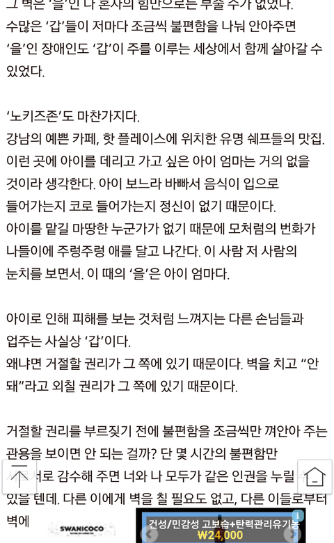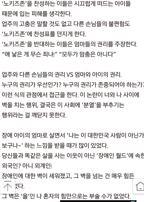이기사도 그렇고 이기사를 명문이라는 당신도 그렇고... 참 기가 막힙니다.횡설수설 여러 논점을 써 놨지만 결론은 결국 대립의 구도를 기본에 깔고 논리를 진행하고 있네요.그나마 중구난방 뭔소린지. 한번 생각을 해봅시다.대한민국 대다수 국민들은 아이와 엄마에 대해 배려할 준비가 되있씁니다.그 배려라는걸 같이좀 하자는데 그말이 그렇게 어렵씁니까?당신이 아이때문에 쩔쩔맬때 우리는 같이 케어하고 참아주고 기타등등 마음의 준비가 되있다는걸 모르시겠씁니까?그러나 당신이 아이를 권리인양 앞세우고 우리에게 일방적인 희생과 배려를 강요한다면, 우리는 분노하고 그런당신에게 맘충이라는 이름표를 붙여주겠다는건데이게 그렇게 어려운 말입니까?